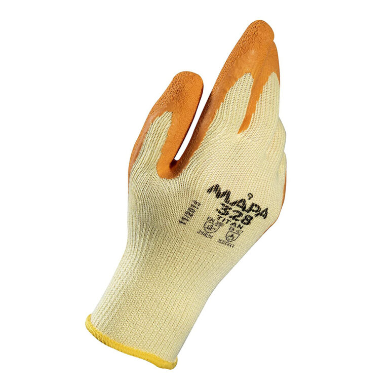 Guante látex natural naranja «rugoso», puño elástico y dorso ventilado.